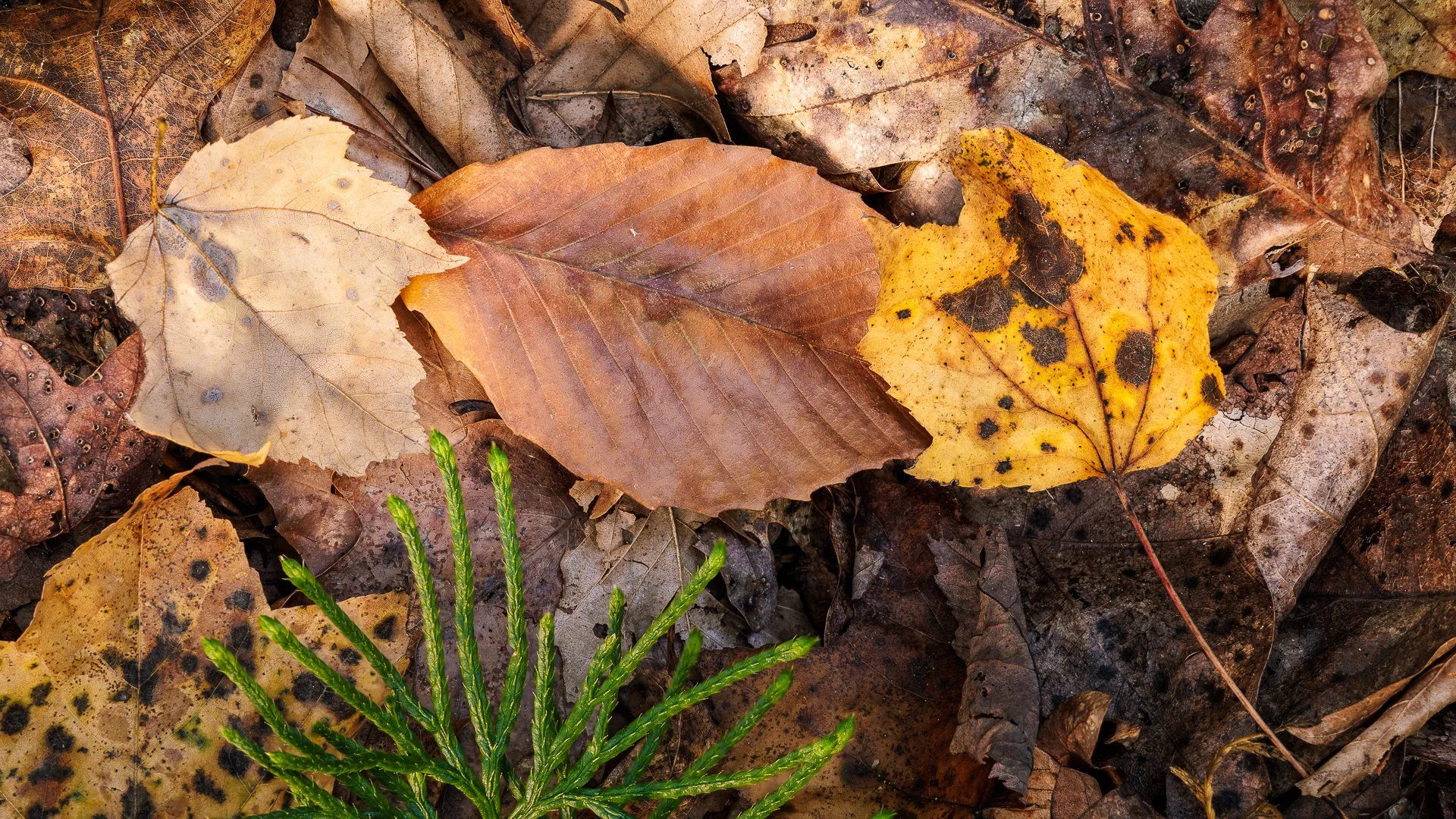 I almost love this image. I am a big fan of chaotic pattern shots like this. Forest floor mayhem, I like to call it. It is fun to look for patterns and textures on the woodland floor. The color of a leaf, the patterns in the decay, the contrast, or the complementary shapes of the different leaves. These seemingly simple things can make up some fascinating and intricate images. It is incredible for me to think about how this jumbled mess on the ground can randomly create such interesting patterns, shapes, and colors.